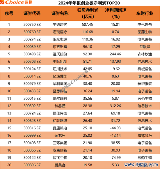 创业板方面,宁德时代以507.45亿元的净利润位居创业板2024年度“盈利王”;迈瑞医疗、阳光电源位居第二、第三,均超百亿;温氏股份、中际旭创、新易盛净利润增长超100%。