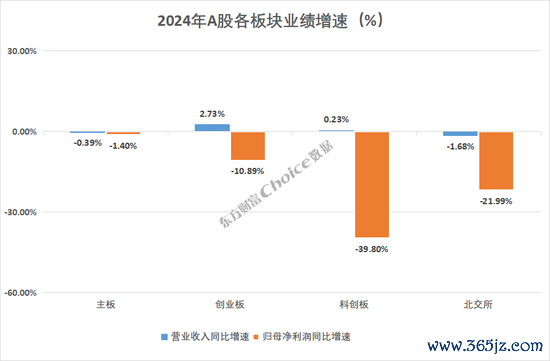 分板块来看,主板、创业板、科创板、北交所2024年分别实现营业收入65.94万亿元、4.01万亿元、1.42万亿元和0.18万亿元,较2023年增长-0.39%、2.73%、0.23%和-1.68%;实现净利润5.03万亿元、0.22万亿元、0.05万亿元和0.011万亿元,分别下降1.4%、10.89%、39.8%和21.99%。