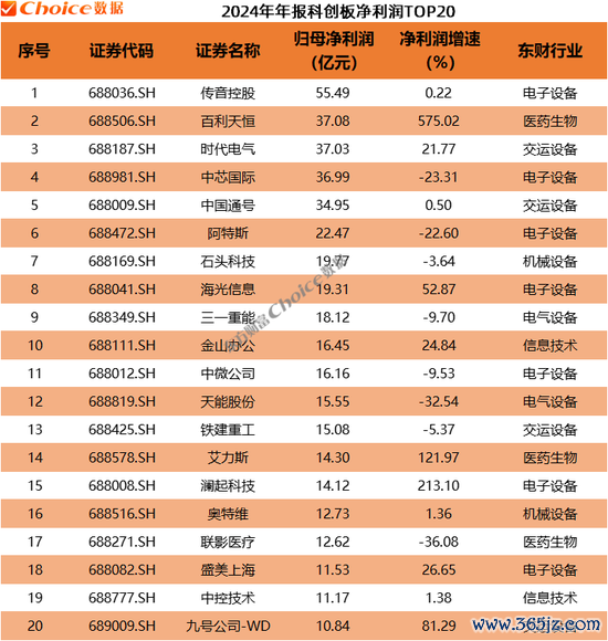 科创板“盈利王”是传音控股,归母净利润达到55.49亿元,百利天恒、时代电气位居第二、第三。