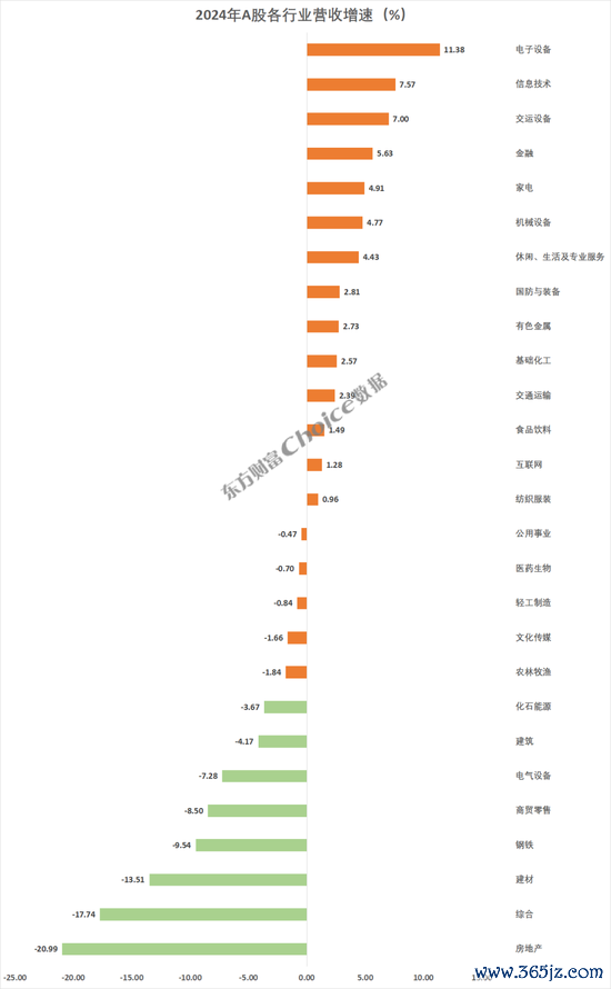 行业营收增速方面线上配资排名,27个东财一级行业中,电子设备营收增速最快,达到11.38%;信息技术、交运设备排名第二、第三,分别为7.57%、7%。房地产、建材等行业2024年营收下降超10%。