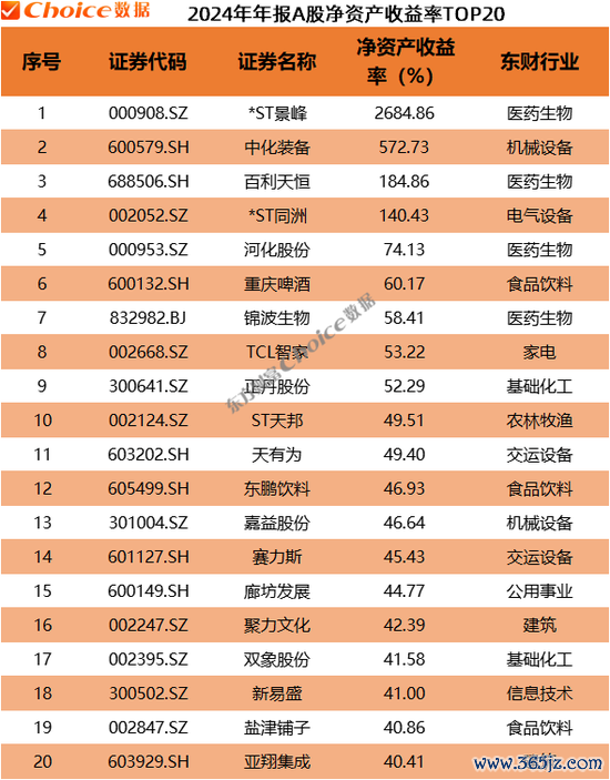 加权净资产收益率方面,排名前三的是*ST景峰、中化装备、百利天恒。