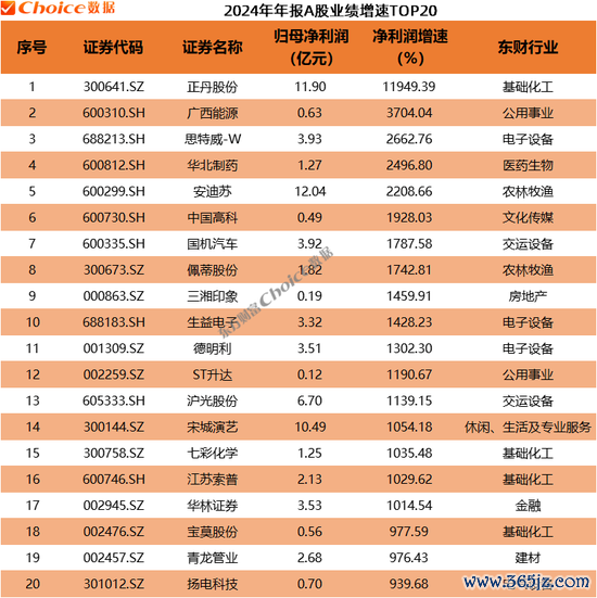 2024年,17家公司净利润增速超过10倍,业绩增速最快的是正丹股份(维权),达到11949.39%;广西能源(维权)、思特威-W业绩增速分别为3704.04%、2662.76%。