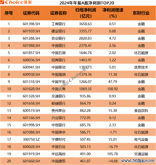 归母净利润方面,金融、石油行业占据榜单前六名,工商银行以3658.63亿元位居2024年A股利润榜首位;建设银行、农业银行、中国银行分别以3355.77亿元、2820.83亿元、2378.41亿元排名第二至第四。中国石油、招商银行、中国移动、中国海油、中国平安、中国人寿净利润均超过1000亿元。