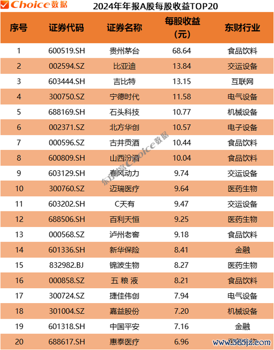 每股收益方面,2024年排名第一的是贵州茅台,基本每股收益为68.64元,比亚迪、吉比特、宁德时代排名第二、第三、第四,每股收益均超过11元。
