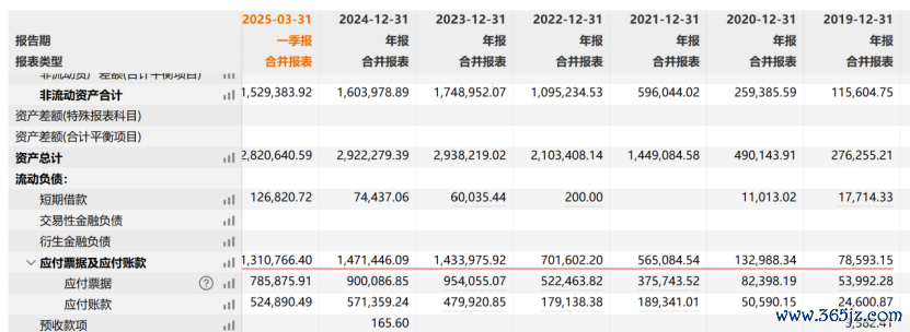 这可以从弘元绿能的债务结构中一窥端倪:到2025年一季度末,弘元绿能流动负债155.86亿元,占到总负债的95%。流动负债的最大一笔,来源于应付票据及应付账款,131.08亿元。